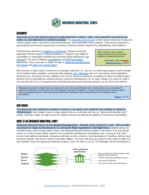 “Michigan can strengthen regional competitiveness and accelerate growth in strategic industries by supporting both regional site readiness and the creation of Advanced Industrial Zones…. Within these Zones, the state would align resources, streamline permissions, and coordinate infrastructure, while requiring participating projects to target high-growth, priority sectors and meet high standards for job quality and community stewardship.”